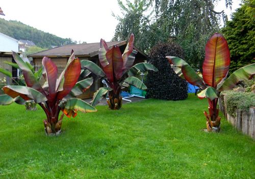 Ciekawa odmiana bananowca charakteryzująca się niezwykle dekoracyjnymi, purpurowo nabiegłymi liśćmi. Dorastająca do kilku metrów. | |