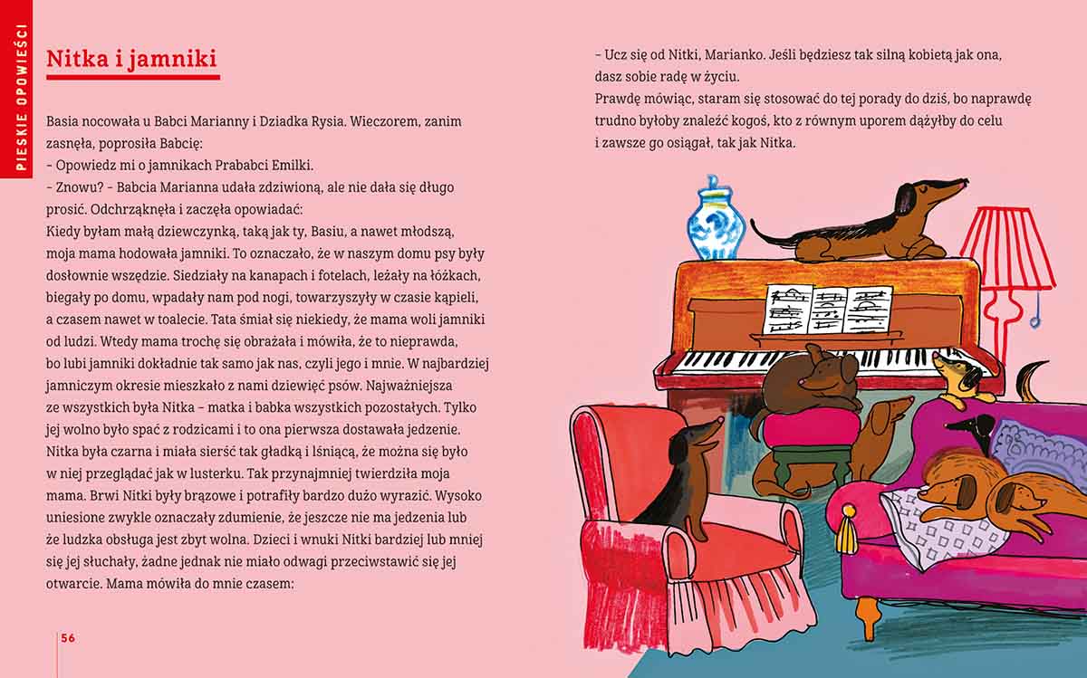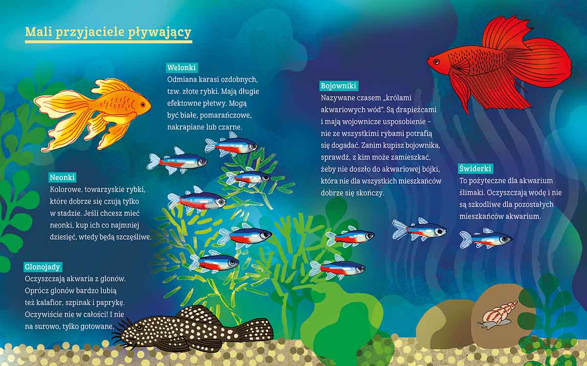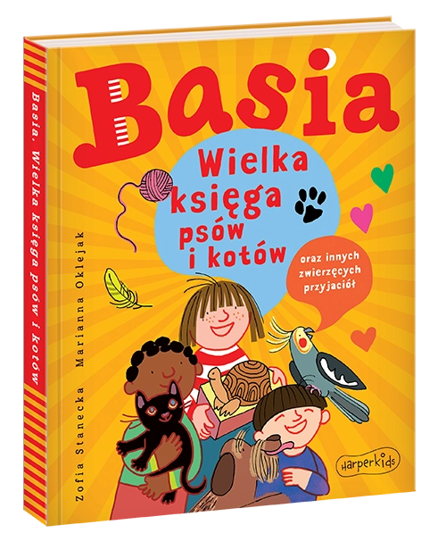 Basia najbardziej na świecie kocha psy, ale jej domowym zwierzęciem jest żółw Kajetan. Anielka ma kudłatego Paszczaka, a przyjacielem Titiego jest kotek Totek. Z kolei w domu Marcela mieszkają psy, koty, chomik i gadający papug Eugeniusz. Życie w otoczeniu zwierząt jest radosne i wspaniałe. Opieka nad nimi bywa jednak wyzwaniem i wiąże się z dużą odpowiedzialnością. W Wielkiej księdze psów i kotów przeczytacie o niesamowitych przygodach zwierzęcych przyjaciół. Ta książka to również skarbnica wiedzy zarówno dla tych, którzy już mają własne zwierzątko, jak i tych, którzy dopiero marzą o futrzastym, śpiewającym czy pływającym przyjacielu. Dowiecie się z niej, jakie są zwyczaje różnych zwierzaków domowych, co jedzą, jak lubią się bawić i, co najważniejsze, jak się o nie troszczyć, żeby były z nami szczęśliwe. Bo zadbane i radosne zwierzę to prawdziwy skarb!