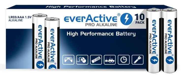 PRO Alkaline - najbardziej zaawansowana linia baterii alkalicznych everActive to wyraźnie poprawiona wydajność w urządzeniach o zwiększonym poborze prądu.