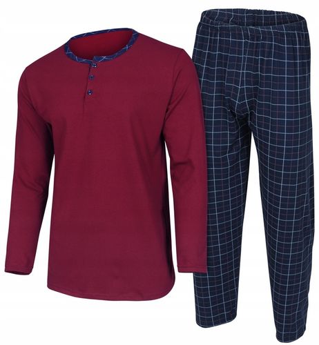 Ta bawełniana dwuczęściowa piżama męska z długim rękawem i długimi spodniami wyróżnia się wyjątkową miękkością i precyzyjnym wykonaniem. Góra rozpinana na trzy guziki, obszyta efektowną lamówką, zapewnia swobodę ruchów i elegancki wygląd, podczas gdy spodnie z elastyczną gumką w pasie, obszytą materiałem, idealnie dopasowują się do ciała, gwarantując komfort przez całą noc.