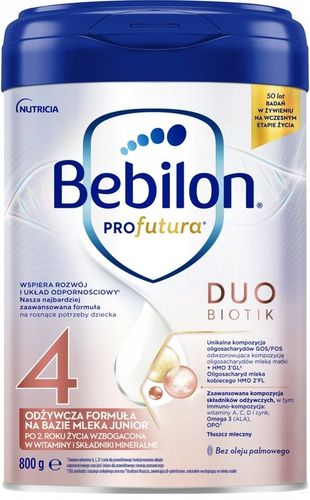 Bebilon Profutura DUO BIOTIK 4 to wyjątkowa, kompletna formuła mleczna stworzona z myślą o najmłodszych. Dzięki zawartości witamin, składników mineralnych oraz DHA (Omega 3), produkt ten zaspokaja wszystkie potrzeby żywieniowe niemowląt już od najwcześniejszych etapów rozwoju.