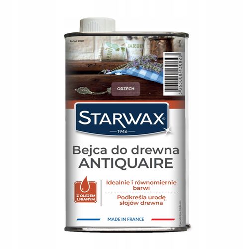 Starwax Bejca do drewna Antiquaire orzech to wysokiej jakości, gotowe do użycia bejce do barwienia drewna surowego nowego lub, z którego usunięto stare wykończenia. Produkt na rozpuszczalniku terpentynowym gwarantującym doskonałe wnikanie we włókna i równomierne wybarwienie. Zawartość oleju drzewnego zapobiega puchnięciu drewna. Po wyschnięciu powierzchnia nie jest tłusta.
