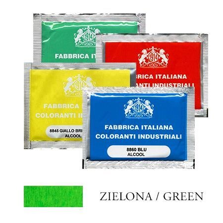 Bejca spirytusowa zielona – M08865 to wysokiej jakości włoska bejca spirytusowa w proszku, idealna do nadawania głębokiego koloru różnorodnym powierzchniom drewnianym. W każdej saszetce znajduje się 8 g proszku, który po rozpuszczeniu w spirytusie pozwala na uzyskanie pożądanego odcienia.