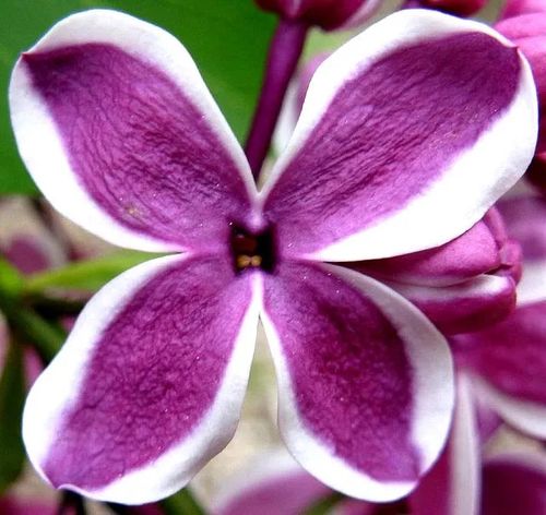 Odmiana bzu SENSATION, bardzo często spotykanego w ogrodach Duży, rozłożysty krzew lub małe drzewko. Rośnie nieco słabiej niż inne odmiany lilaka pospolitego. Dorasta do 3 m wys. Liście sercowate, błyszczące, zielone. Pączki kwiatowe ciemnopurpurowe. Kwiaty bardzo oryginalne, pojedyncze, dwubarwne, purpurowe z białym brzegiem. Kwiatostany niewielkie, wydłużone, luźne, dł. ok. 30 cm. Kwitnie średnio obficie, V. Najlepiej rośnie w słońcu, na żyznych, próchnicznych glebach. Nie lubi gleb ciężkich i zalewanych. Dobrze znosi suszę i miejskie środowisko. Kwiaty bez szkody dla rośliny można ścinać do wazonu. Odmiana idealnie nadaje się do małych ogrodów.