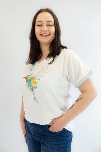 Ta biała bluzka damska z uroczym nadrukiem koliberka na przodzie to idealny wybór na ciepłe letnie dni. Wykonana z wysokiej jakości materiałów - 95% wiskozy i 5% elastanu, zapewnia nie tylko doskonały komfort noszenia, ale także trwałość i elastyczność. Dostępna w rozmiarach od 40 do 52, obejmując także rozmiary plus size, ta bluzka jest stworzona z myślą o kobietach o różnych sylwetkach, podkreślając ich piękno i wygodę. Z lekkim, letnim nadrukiem koliberka na przodzie dodaje uroku i oryginalności każdej stylizacji.