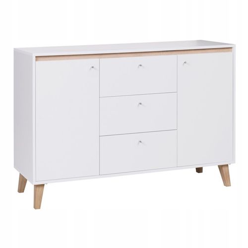 Stylowa, pojemna komoda będąca przejawem najwyższej jakości wzornictwa. Prosta minimalistyczna forma i jasne barwy sprawiają, że mebel świetnie komponuje się w każdym wnętrzu. Połączenie arktycznej bieli i ciepłego drewna sprawia, że komoda wygląda niezwykle subtelnie i nowocześnie.