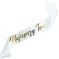 Prezentujemy Państwu biała szarfę ze złotym nadrukiem Najlepszy Teściu.