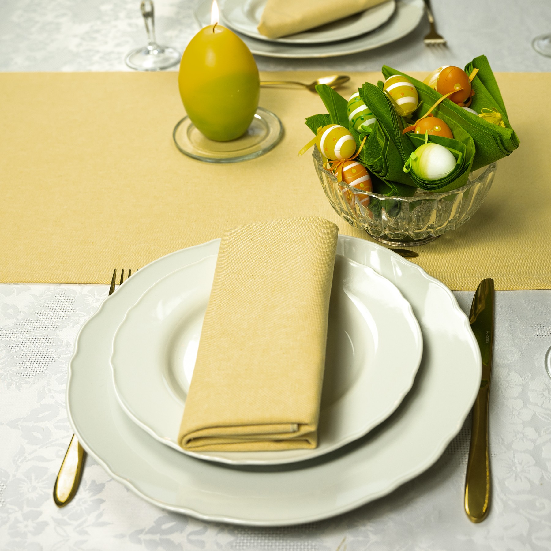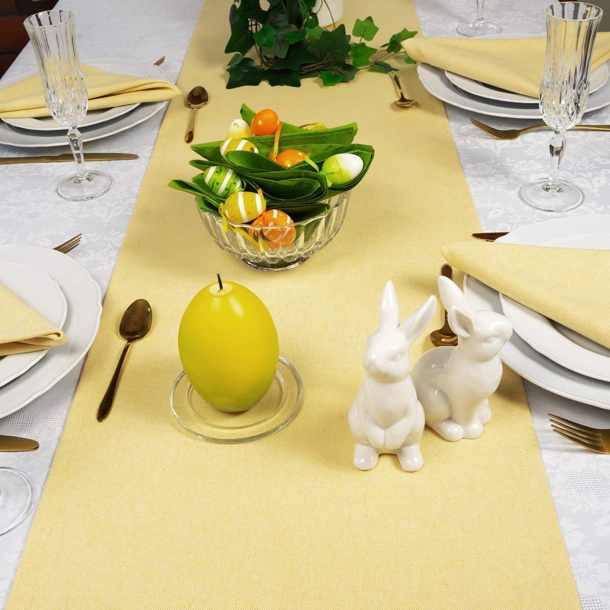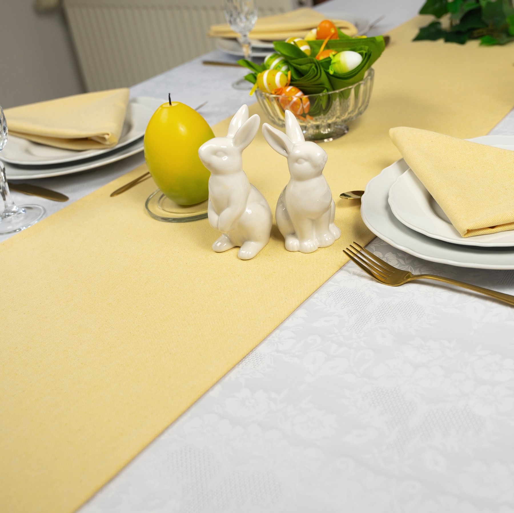Wykonany z wysokiej jakości tkaniny - 80% bawełny i 20% PE, Bieżnik charakteryzuje się gramaturą 240 g/m2, co zapewnia trwałość oraz elegancki wygląd. Pastele, a zwłaszcza jasny żółty kolor, dodają świetlistej świeżości, tworząc przyjemną atmosferę podczas codziennych posiłków. Detale wykonania świadczą o staranności, a jego Uniwersalny design sprawia, że pasuje do różnych rodzajów zastawy i wystroju - od klasycznego drewnianego stołu, po nowoczesne akcenty w kolorach różowym, białym czy żółtym.