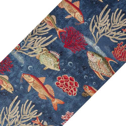 Zaprezentuj swoją jadalnię za pomocą ekskluzywnego bieżnika z gobelinu klasy premium, gdzie głębokie niebieskie tło ożywiają delikatne motywy ryb i koralowców. Ten wyrafinowany wzór nie tylko dodaje charakteru i elegancji każdemu wnętrzu, ale również tworzy atmosferę morskiej przygody i spokoju. Idealny na rodzinne obiady i specjalne okazje, zapewniając niezapomniane doznania estetyczne przy każdym posiłku.