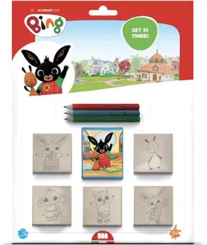 Przedstawiamy zestaw pieczątek na licencji „Bing”. W skład zestawu wchodzą: • 5 pieczątek, • 1 poduszeczka do tuszu, • 3 kredki. Wymiary opakowania: 21.0 x 2.0 x 28.0