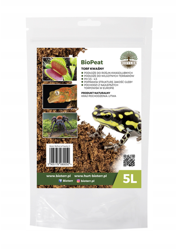 Oferujemy opakowanie zawierające 5 litrów podłoża Bioterr BioPeat, co pozwoli na długotrwałe wykorzystanie w Twoim terrarium lub ogrodzie.