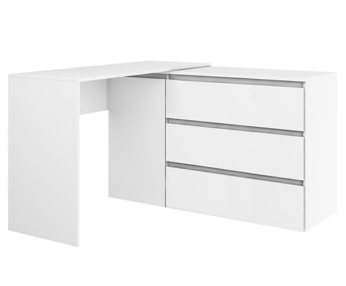Biurko narożne MEGAN N5 - białe to idealne rozwiązanie dla każdego, kto ceni sobie nowoczesność i funkcjonalność w swoim biurze lub domu. Przeznaczone zarówno dla uczniów, jak i profesjonalistów, to biurko łączy w sobie elegancki design i praktyczne rozwiązania, które poprawiają komfort pracy.