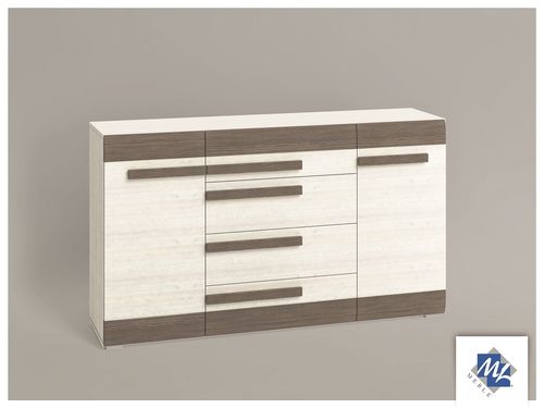 Komoda szeroka z 2 drzwiami i 4 szufladami. W szufladach zastosowano wzmocnione dna. Za drzwiami półki z płyty.