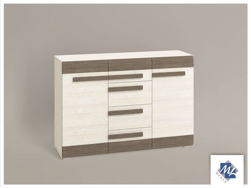 Komoda szeroka z 2 drzwiami i 4 szufladami. Za drzwiami półki z płyty.