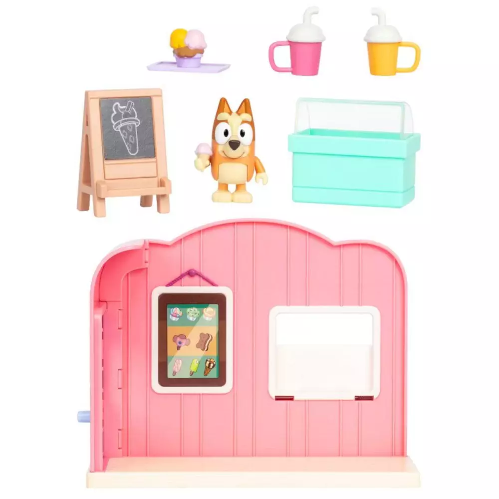 Bluey jest bystrym, sześcioletnim niebieskim pieskiem, który uwielbia dobrą zabawę. Ma wiele fajnych pomysłów, które sprawiają, że każdy zwyczajny dzień zamienia się w ciąg radosnych przygód! Lodziarnia jest zestawem, który zachęca przedszkolaki do wcielenia się w małego sprzedawcę lodów. Razem z pieskiem Bingo odkryj najsmaczniejsze smaki deserów lodowych na świecie! Odtwarzaj ulubione sceny z serialu i twórz własne historie z oryginalnymi, licencjonowanymi figurkami! W opakowaniu znajdują się: 1 x lodziarnia, 1 x figurka Bingo, 1 x zamrażarka do lodów, 5 x akcesoria, 1 x arkusz naklejek.