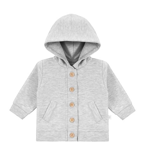 Szara, bawełniana bluza to obowiązkowy element garderoby, zarówno dla dziewczynek, jak i dla chłopców. Jest bardzo praktyczna i do tego uniwersalna, można nosić ją niemal do każdej stylizacji. Ten model uszyty został z 100% bawełny, co zapewnia maluszkowi komfort na najwyższym poziomie. Materiał posiada certyfikat Oeko-Tex Standard 100 Tekstylia godne zaufania. Bluza zapinana jest na drewniane, dekoracyjne guziczki, z przodu posiada dwie otwarte kieszenie. Rękawy zakończone ściągaczami są bardzo wygodne przy ubieraniu malucha, nawet lekko za długich nie trzeba ciągle podwijać. Głęboki kaptur sprawdza się podczas spacerów w chłodniejsze dni. Taką bluzę zawsze warto mieć pod ręką.