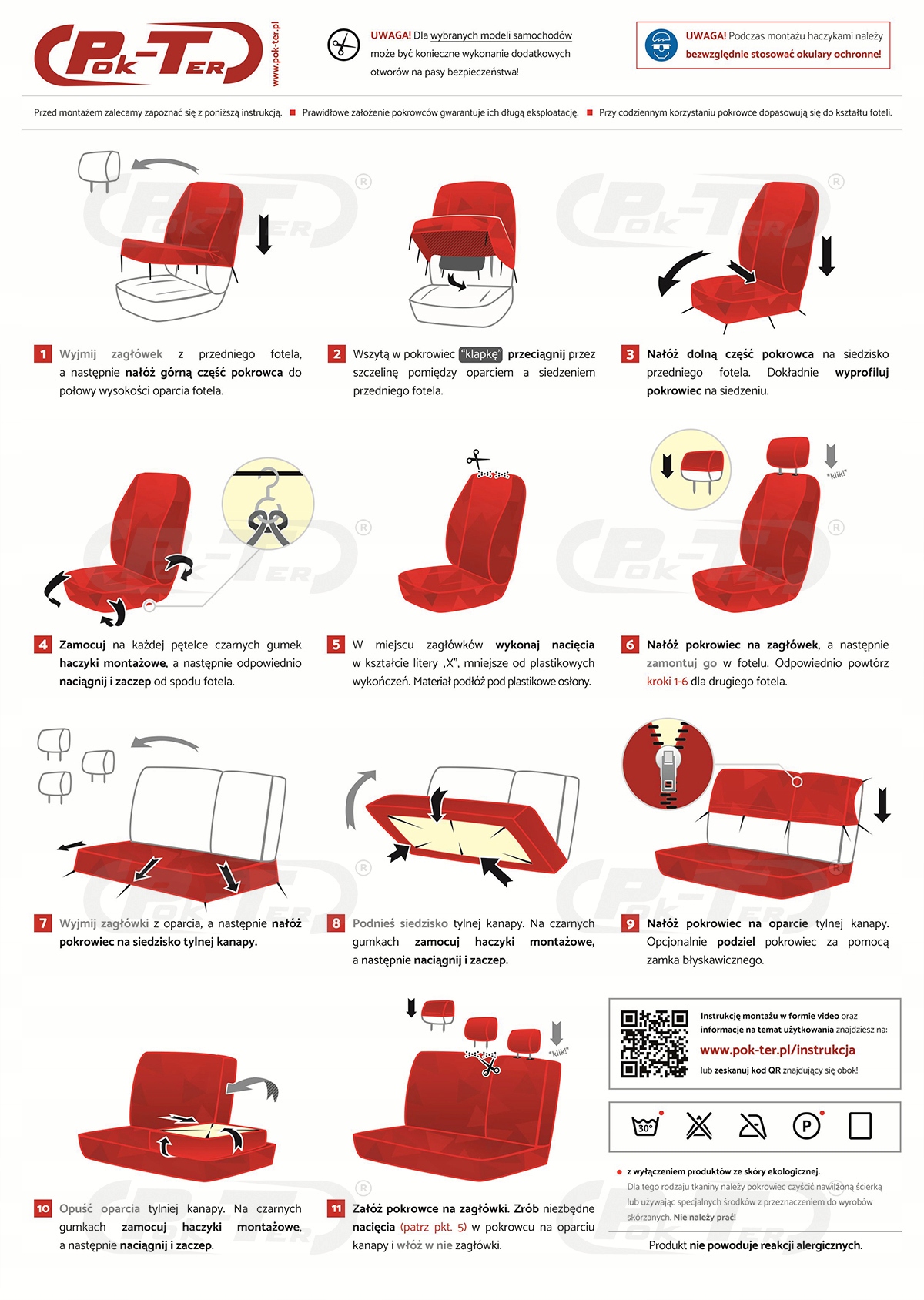 Sprzedawany komplet zawiera: zestaw pokrowców (2 fotele przednie, 2 pokrowce na kanapę, komplet 5 zagłówków), komplet haczyków montażowych, instrukcję montażu oraz opakowanie.