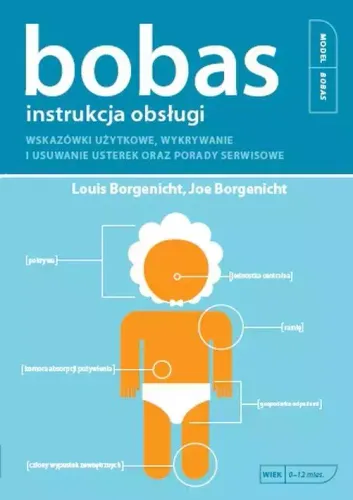 Nareszcie! Technologiczna instrukcja obsługi noworodka dla niewtajemniczonych! Zaprogramowaliście odtwarzacz DVD, przeinstalowaliście Microsoft Windows, wiecie nawet, jak odbierać pocztę w Palm Pilocie, ale żadne z tych doświadczeń nie przygotowało was na największy cud technologiczny świata: na nowo narodzone dziecko! Bobas. Instrukcja obsługi, zawierający dziesiątki szczegółowych instrukcji i pomocnych schematycznych diagramów, przynosi odpowiedzi na tysiące często zadawanych pytań: "Jak najlepiej przewinąć niemowlę?", "Jak sprawić, żeby przespało noc?", "Kiedy zabrać je do lekarskiego serwisu?". Bez względu na złożoność waszych pytań, pomoc znajdziecie w tej książce, dzięki uprzejmości znanego pediatry doktora Louisa Borgenichta oraz jego syna, Joe Borgenichta. Razem przedstawiają mnóstwo pożytecznych rad dla każdego, kto chce poznać podstawy opieki nad bobasem.