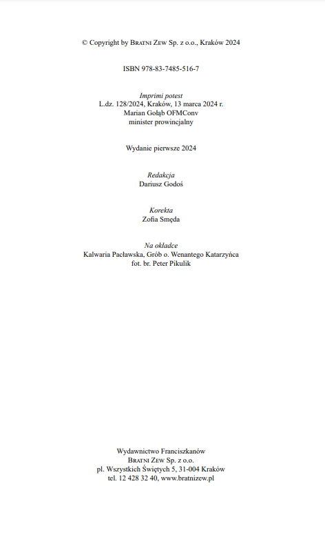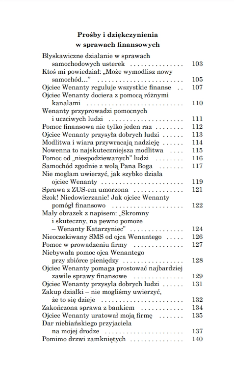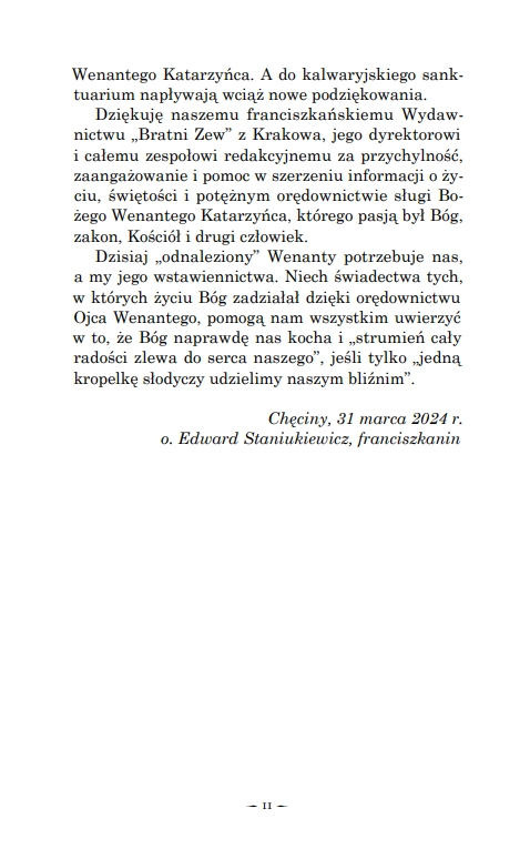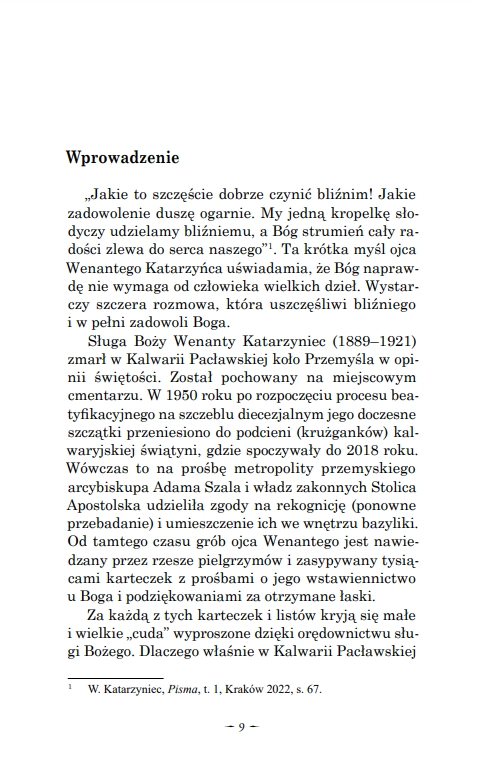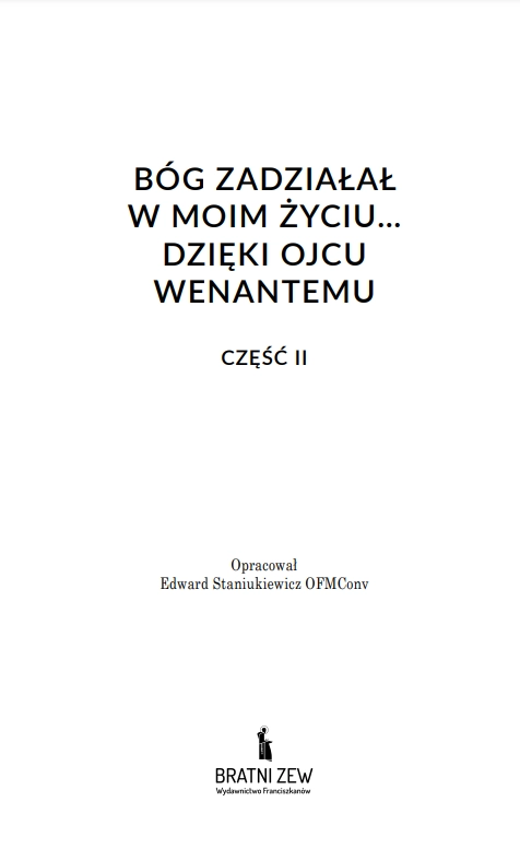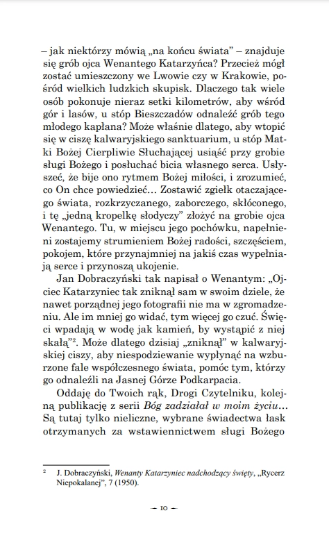 „Ojciec Katarzyniec tak zniknął sam w swoim dziele, że nawet porządnej jego fotografi i nie ma w zgromadzeniu. Ale im mniej go widać, tym więcej go czuć. Święci wpadają w wodę jak kamień, by wystąpić z niej skałą”. – Jan Dobraczyński Sługa Boży Wenanty Katarzyniec dość niespodziewanie wypłynął dziś na wzburzone fale zagubionego w chaosie świata. Jest potężnym orędownikiem przed Bogiem. Pomaga w różnych sprawach. Jak pokazują świadectwa, jest mu bliski każdy człowiek i każdy problem. To kolejna publikacja z serii „Bóg zadziałał w moim życiu…” Są tutaj zebrane tylko nieliczne świadectwa łask otrzymanych za wstawiennictwem sługi Bożego, jakie napłynęły do Jasnej Góry Podkarpacia.