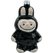 Szklana bombka inspirowana postacią w stylu Labubu to ręcznie wykonana ozdoba choinkowa, która łączy modny design „designer toys” z klasycznym polskim rzemiosłem. Figurkę uformowano z dmuchanego szkła, następnie ręcznie pomalowano i wykończono drobnym brokatem podkreślającym kontury pyszczka i uszu. Głęboka, połyskująca czerń kostiumu pięknie kontrastuje z jasną, uśmiechniętą buzią – dzięki temu bombka jest widoczna nawet na gęstej, zielonej choince. Lekka konstrukcja i metalowa koronka z oczkiem sprawiają, że zawieszka dobrze trzyma się na każdej gałązce.