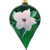 Elegancka bombka choinkowa w kształcie kropli (łezki) wykonana z cienkościennego, dmuchanego szkła. Głęboka, szmaragdowa zieleń została zestawiona z ręcznie malowanym kwiatem w odcieniach pudrowego różu, z delikatnymi akcentami brokatu i czarnymi pręcikami. Złota skuwka z oczkiem do zawieszania dopełnia całość i podkreśla luksusowy charakter ozdoby. Smukła forma pięknie odbija światło lampek, optycznie wysmuklając gałązkę choinki.