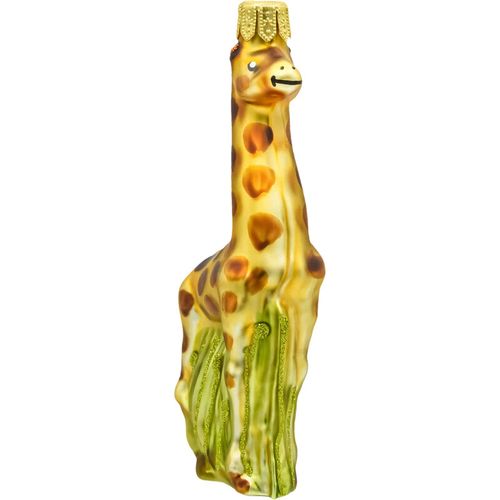 Wprowadź na choinkę klimat safari! Ta figuratywna bombka szklana żyrafa 10 cm łączy klasyczne rzemiosło z modnym, egzotycznym motywem. Korpus zwierzęcia został dmuchany z cienkiego szkła, następnie ręcznie malowany w odcieniach miodu i karmelu z charakterystycznymi, czekoladowymi plamami. Delikatne akcenty brokatu w kolorze złota i miedzi podkreślają grzywę i trawę sawanny u podstawy figurki, pięknie odbijając światło lampek.