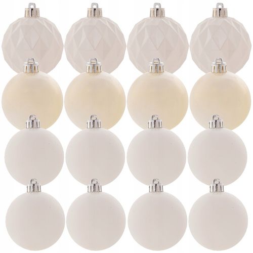 Zestaw składa się z 16 pięknych bombek w trzech różnych wzorach i odcieniach, łączących elegancką biel z subtelnymi akcentami kremowymi. Dzięki temu możesz stworzyć wyjątkową, spójną dekorację, która doda Twojemu wnętrzu niepowtarzalnego uroku i blasku.