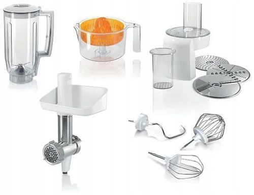 Bogaty zestaw akcesoriów, w tym hak do ciasta, trzepaczki do ubijania i mieszania, maszynka do mielenia mięsa, krajalnica z nakładkami, wyciskarka do cytrusów oraz blender, umożliwia wszechstronne przygotowywanie dań. Schowek na kabel i możliwość mycia większości elementów w zmywarce dodają praktyczności, czyniąc codzienne gotowanie prostym i przyjemnym doświadczeniem.