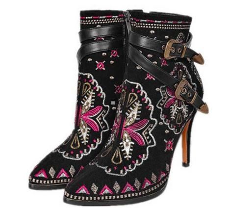 Botki Damskie - Szpilka - Haftowane - Nowość to idealne połączenie elegancji, wygody i modnego designu. Te niezwykle stylowe botki to must-have w szafie każdej kobiety, która pragnie podkreślić swoją indywidualność i wyjątkowy gust. Wykonane z naturalnego zamszu, w wyjątkowym wielokolorowym zestawieniu, przyciągają wzrok i dodają stylizacji charakteru.