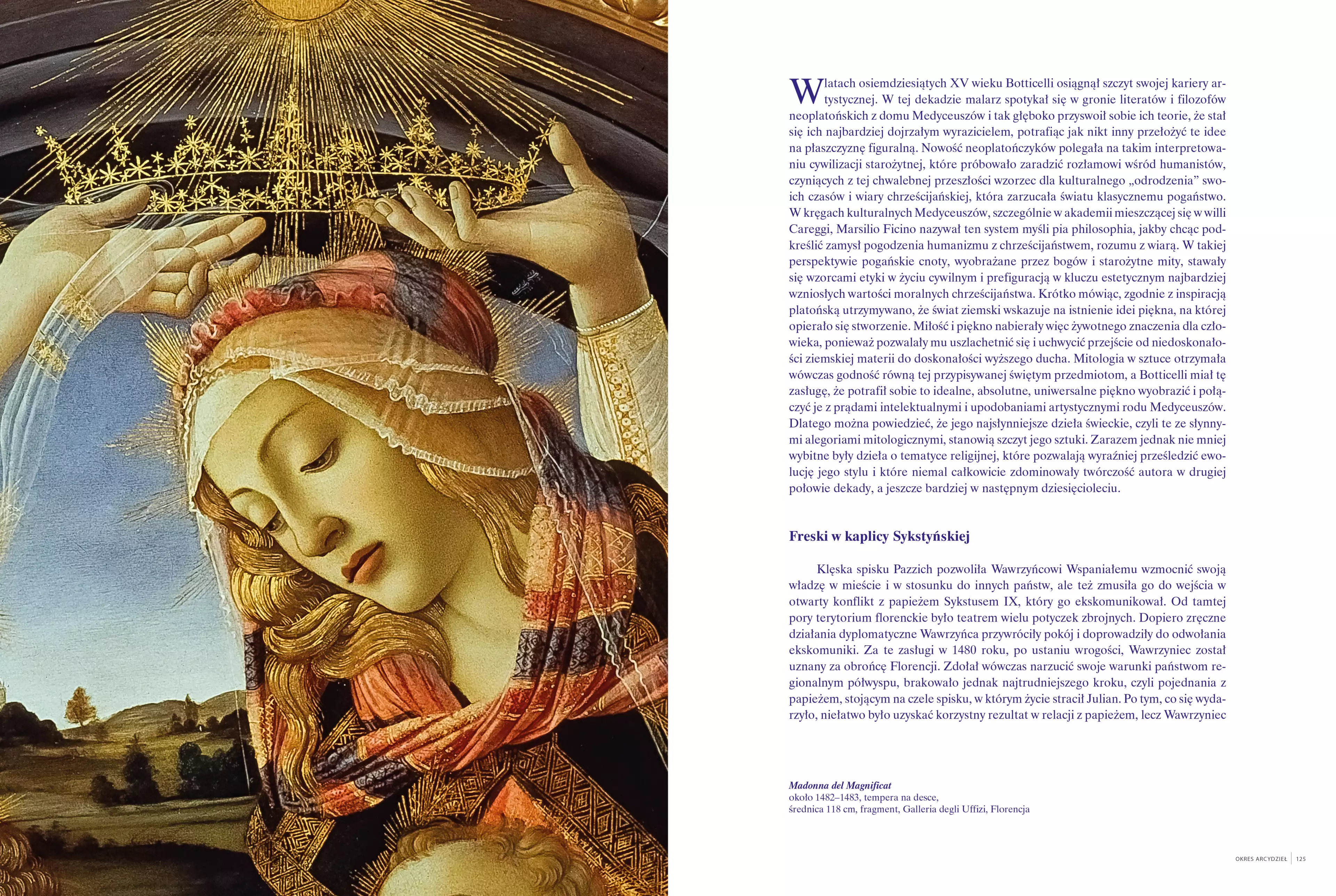 Sandro Botticelli już od pierwszych kroków stawianych w szkole Filippa Lippiego we Florencji stał się najbardziej autentycznym wyrazicielem renesansu drugiej połowy XV wieku. Album prezentuje Czytelnikowi obszerny zbiór największych arcydzieł Mistrza, jak również nieznane malowidła będące przedmiotem dyskusji specjalistów zajmujących się kwestiami autorstwa. Badacz otrzymuje więc sposobność zapoznania się niepublikowanymi dotąd materiałami. Ponadto ilustracje przedstawiające m.in. arcydzieła z bocznych ścian kaplicy Sykstyńskiej pozwalają zagłębić się w zagadnienia tradycyjnie rzadziej poruszane. Bogatą szatę graficzną albumu wzbogacają także rysunki Botticellego do Boskiej komedii oraz jego szkice do haftów na szatach liturgicznych. Opowieść autora wieńczy omówienie okresu osobistego przełomu w życiu artysty oraz jego ostatniego etapu stylistycznego. Ta poruszająca lektura uświadamia nam, że mamy do czynienia z Botticellim „Wielkim”. Giancarlo Benevolo (ur. w 1965 r.) jest kierownikiem Archiwum Historycznego Miejskiego Muzeum Sztuki Antycznej w Bolonii, badaczem średniowiecza i renesansu, zwłaszcza historii i sztuki włoskiej tego okresu. Jest organizatorem wystaw artystycznych, autorem wielu rozpraw i książek poświęconych historii społeczeństwa i kultury średniowiecza oraz renesansu miasta Bolonii i okolic. Wykłada na Indiana University (Bologna) oraz filii Uniwersytetu bolońskiego w Rawennie.