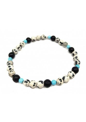 Bransoletka wykonana na gumce Kamień: Jaspis + Howlit + Lawa Rozmiar kamienia: 6mm Rozmiar uniwersalny.