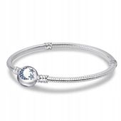 Bransoletka modułowa z księżycem i gwiazdkami z cyrkoniami wykonana ze srebra próby 925 posiada ozdobne zapięcie w kształcie półksiężyca i dwóch gwiazd z niebieskimi kryształkami. Gładki, srebrny splot jest kompatybilny z zawieszkami typu charms, umożliwiając tworzenie spersonalizowanej kompozycji. Biżuteria nie zawiera niklu, jest bezpieczna dla skóry i przeznaczona do codziennego noszenia.