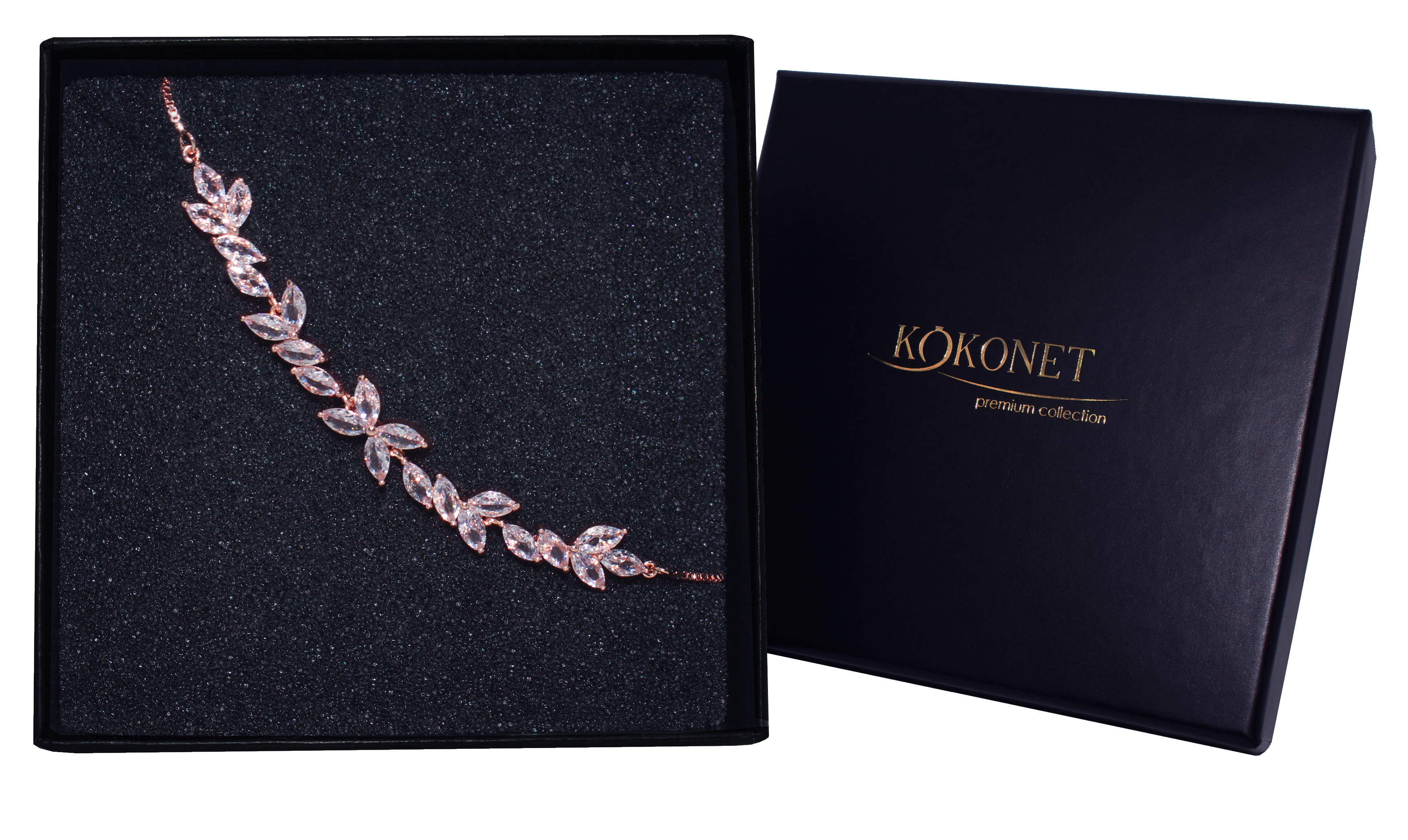 Posiadając Bransoletkę Różowe Złoto Listki Kryształki Boho Glam BLASK, zyskujesz nie tylko piękny dodatek do swojej ślubnej kreacji, ale również element, który będzie ozdobą na wiele innych wyjątkowych okazji. Eleganckie pudełko z logo marki KOKONET, w którym jest zapakowana, sprawia, że jest to również doskonały prezent. Rozpieszczaj siebie lub bliską osobę tą luksusową biżuterią, która odmieni każdą stylizację i sprawi, że poczujesz się wyjątkowo!