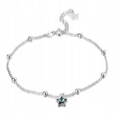 Srebrna bransoletka wykonana z wysokiej jakości srebra próby 925 zachwyca delikatnym łańcuszkiem ozdobionym kuleczkami i zawieszką w kształcie gwiazdki z niebieskim kryształem. Chłodny, srebrzysty połysk pięknie kontrastuje z głębokim odcieniem błękitu, dodając całości elegancji. Bransoletka jest hipoalergiczna i posiada regulowane zapięcie, dzięki czemu idealnie dopasowuje się do każdego nadgarstka.
