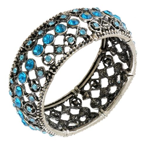 Elegancka bransoletka w kolorze stylizowanym na stary srebrny, pasuje na dłoń o obwodzie do 16 cm. Wykonana z metalu. Tylnia połowa jest wysadzana dżetami. Pięknie ozdobi nadgarstek podczas spotkań towarzyskich, ale także pasować będzie na co dzień i do pracy.