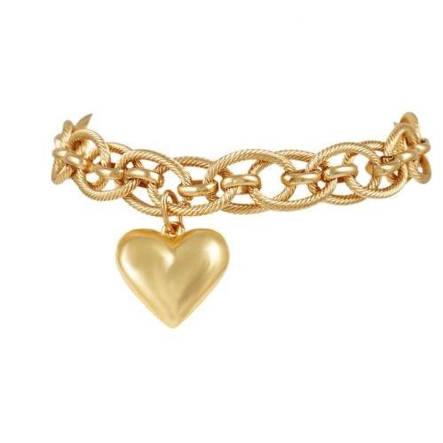 Pozłacana bransoletka o ciekawym splocie z pękatym sercem. Długość bransoletki 17 cm + 4 cm przedłużki. Wielkość serca 2 cm x 2cm.
