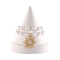 Elegancka bransoletka składająca się z dwóch rzędów satynowych pereł, ozdobiona subtelną zawieszką w kształcie słoneczka. Połączenie delikatnego połysku pereł z uroczym złotym akcentem nadaje biżuterii lekkości i wyjątkowego charakteru. Cechy produktu: materiał: satynowe perły, zawieszka w kształcie słoneczka, dwa rzędy pereł, subtelny połysk i nowoczesny design, regulowane zapięcie (17 cm + 4 cm przedłużki)