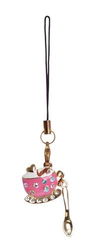 Metalowa zawieszka - różowa filiżanka z łyżeczką, z kryształkami.