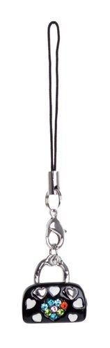 Metalowa zawieszka - torebka z serduszkami, z kolorowymi kryształkami.