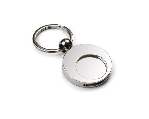 Brelok metalowy wraz z żetonem, o chromowanej powierzchni.