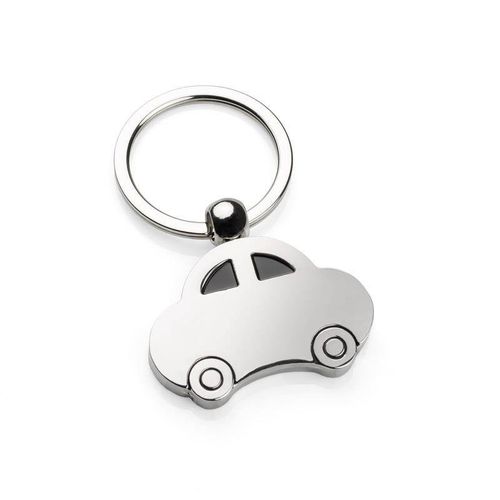 Brelok do kluczy z zawieszką w kształcie samochodu, wykonany z chromowanego metalu.