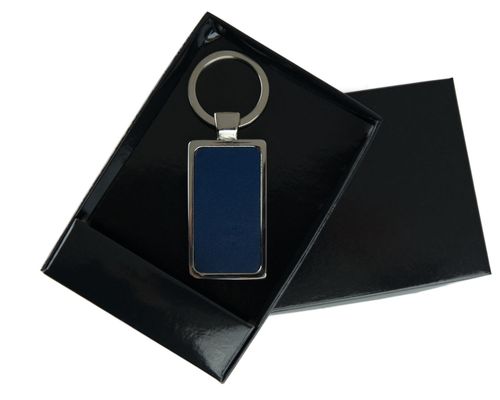 Metalowy brelok o eleganckim wyglądzie w srebrnym kolorze i błyszczącym wykończeniu. Na jego froncie znajduje się prostokątny element ze skóry naturalnej w kolorze czerwonym, granatowym lub czarnym.