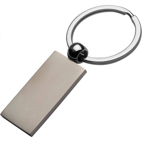 Metalowy brelok do kluczy z prostokątną matową zawieszką, na której można umieścić logotyp.