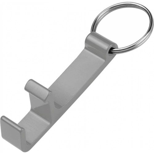 Metalowy brelok z otwieraczem do butelek, którego można użyć również jako stojaka na telefon.