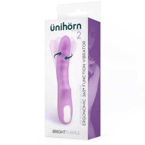 Wielofunkcyjny obrotowy wibrator tworzony z myślą o stymulacji pochwy i punktu G. Produkt wykonany z przyjemnego i gładkiego w dotyku sylikonu łatwego do utrzymania w czystości. Odpowiednio wyprofilowana i obrotowa końcówka wibratora idealna do punkt G a faliste uwypuklenia masują wejście do pochwy. Bright Purple został wyposażony w silikonową wypustkę.