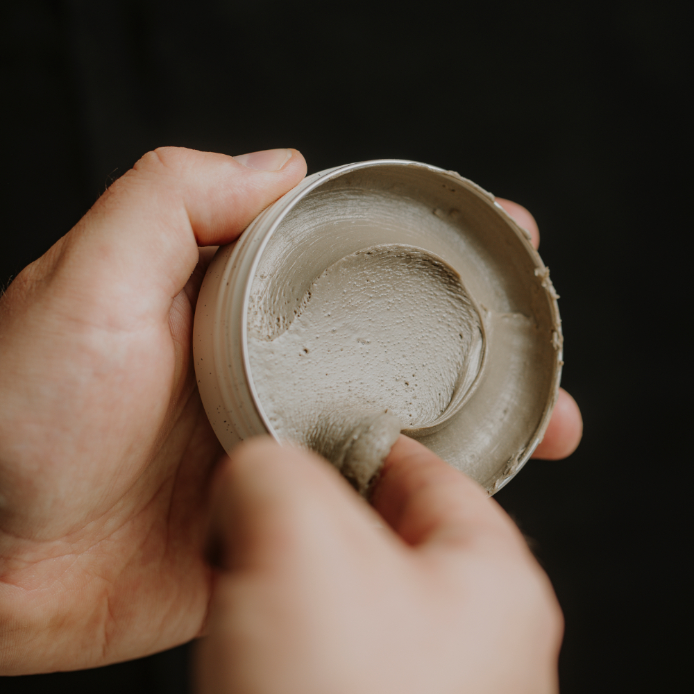 Łączy w sobie trzy rodzaje glinek – kaolin, czarną glinkę (Illite, Quartz, Kaolin) oraz ziemię okrzemkową – co pozwala uzyskać pełny, matowy efekt bez zbędnego obciążenia.