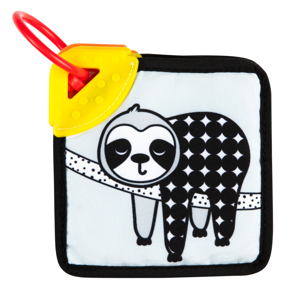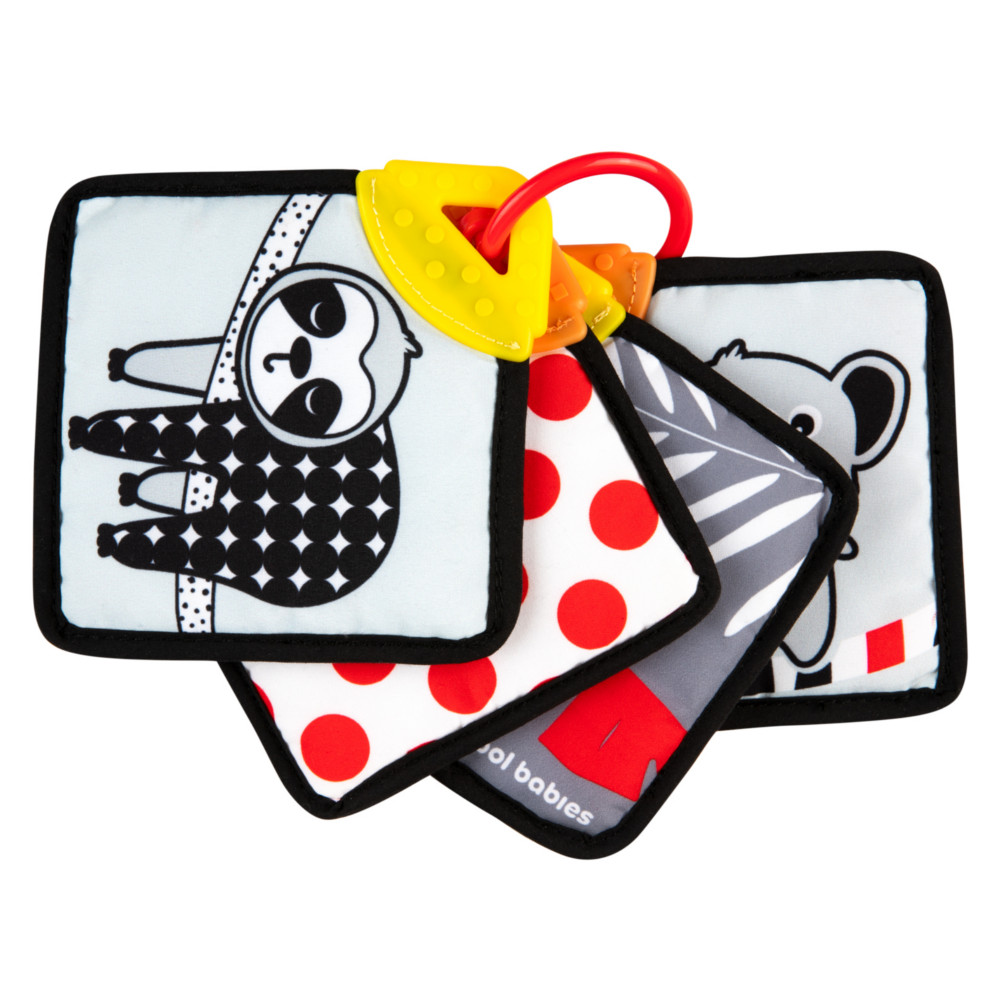 Miękkie karty kontrastowe stymulują wzrok najmłodszych dzieci, których świat tuż po urodzeniu jest czarno-biały. Noworodki nie rozróżniają barw, widzą jedynie odcienie szarości i najłatwiej jest im dostrzec duże, kontrastowe zestawienie czarno-białych wzorów. Karty kontrastowe ułatwiają Maluszkowi skupić wzrok na oglądanym obrazku, a przy okazji dają możliwość budowania relacji i bliskości podczas pierwszych wspólnych zabaw. Karty połączone są ze sobą plastikowym zaczepem, który umożliwia zamocowanie zabawki w łóżeczku, wózku, bujaku czy foteliku samochodowym. Dzięki temu karty zapewnią dziecku rozrywkę w domu, na spacerze i w podróży. Karty sensoryczne Canpol babies można również rozdzielić i podawać pojedynczo do zabawy. Elastyczne gryzaki sensoryczne na rogu każdej karty przyniosą Maluszkowi ulgę w okresie ząbkowania, masując dziąsełka i łagodząc swędzenie od wyrzynających się zębów. Karty są miękkie, wykonane z przyjemnego w dotyku materiału.