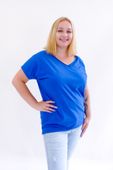 Koszulka wykonana jest z wysokiej jakości bawełny z dodatkiem elastanu, co zapewnia jej komfort noszenia i doskonałe dopasowanie do sylwetki. Dekolt w kształcie litery V dodaje elegancji i kobiecości, a krótkie rękawy czynią ją idealnym wyborem na cieplejsze dni. Chabrowy kolor jest energetyczny i odświeżający, doskonale komponujący się z różnymi stylami i kolorami, co czyni koszulkę wszechstronnym elementem garderoby.