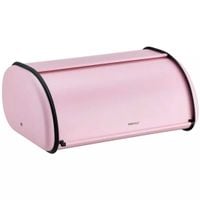 Duży pojemnik na pieczywo typu roll top wykonany z lakierowanej stali nierdzewnej w kolorze różowym.