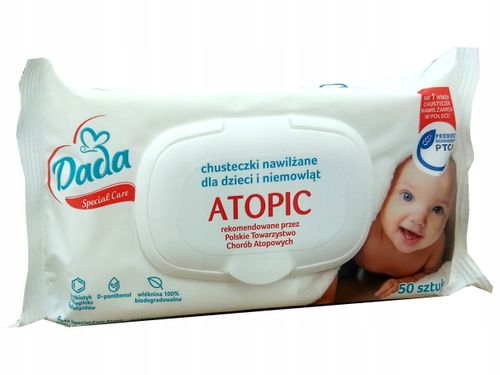 Chusteczki nawilżane Dada Special Care Atopic przeznaczone do codziennej pielęgnacji skóry dzieci i niemowląt pakowane po 50 chusteczek w opakowaniu. Produkt rekomendowany przez Polskie Towarzystwo Chorób Atopowych..